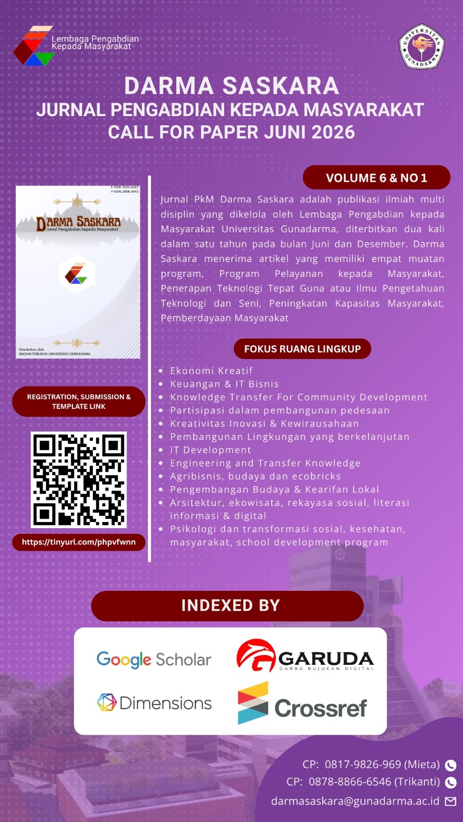 Darma Saskara : Jurnal pengabdian Kepada Masyarakat adalah publikasi ilmiah multidisiplin keilmuan yang diterbitkan dan dikelola oleh Lembaga Pengabdian Kepada Masyarakat Universitas Gunadarma. Mainstreaming kajian Jurnal ini meliputi berbagai disiplin keilmuan kegiatan pengabdian kepada masyarakat dari berbagai bidang ilmu pada masing-masing program studi di Universitas Gunadarma. Fokus dan ruang lingkup pengabdian kepada masyarakat pada jurnal ini diantaranya : Ekonomi kreatif, Keuangan dan IT bisnis, Knowledge Transfer for Community Development, partisipasi dalam Pembangunan Pedesaan, RW, RT, Pelatihan dan Pengembangan Kompetensi, Kreativitas, Inovasi dan Kewirausahaan, Pembangunan Lingkungan yang Berkelanjutan, IT Development, Engineering and Transfer Knowledge, Agribisnis, Budidaya, Ecobricks, Pengembangan Budaya dan Kearifan Lokal, Arsitektur, Ekowisata, Rekayasa Sosial, Literasi Informasi dan Digital, Psikologi dan Transformasi sosial, Kesehatan Masyarakat, School Development Program.