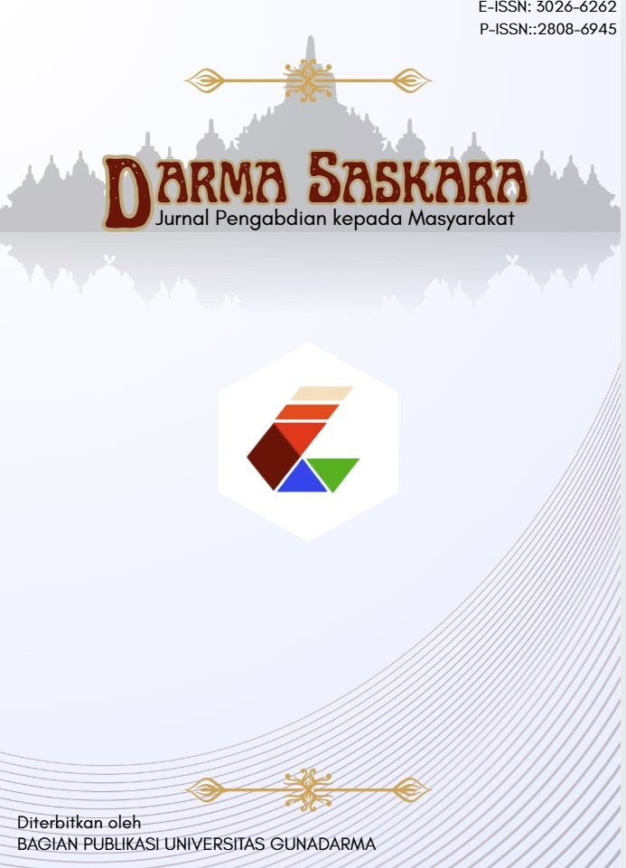 Darma Saskara : Jurnal pengabdian Kepada Masyarakat adalah publikasi ilmiah multidisiplin keilmuan yang diterbitkan dan dikelola oleh Lembaga Pengabdian Kepada Masyarakat Universitas Gunadarma. Mainstreaming kajian Jurnal ini meliputi berbagai disiplin keilmuan kegiatan pengabdian kepada masyarakat dari berbagai bidang ilmu pada masing-masing program studi di Universitas Gunadarma. Fokus dan ruang lingkup pengabdian kepada masyarakat pada jurnal ini diantaranya : Ekonomi kreatif, Keuangan dan IT bisnis, Knowledge Transfer for Community Development, partisipasi dalam Pembangunan Pedesaan, RW, RT, Pelatihan dan Pengembangan Kompetensi, Kreativitas, Inovasi dan Kewirausahaan, Pembangunan Lingkungan yang Berkelanjutan, IT Development, Engineering and Transfer Knowledge, Agribisnis, Budidaya, Ecobricks, Pengembangan Budaya dan Kearifan Lokal, Arsitektur, Ekowisata, Rekayasa Sosial, Literasi Informasi dan Digital, Psikologi dan Transformasi sosial, Kesehatan Masyarakat, School Development Program.
